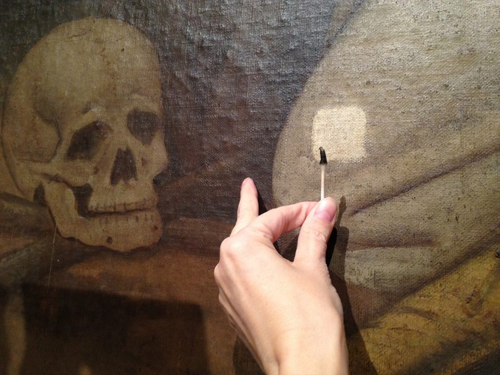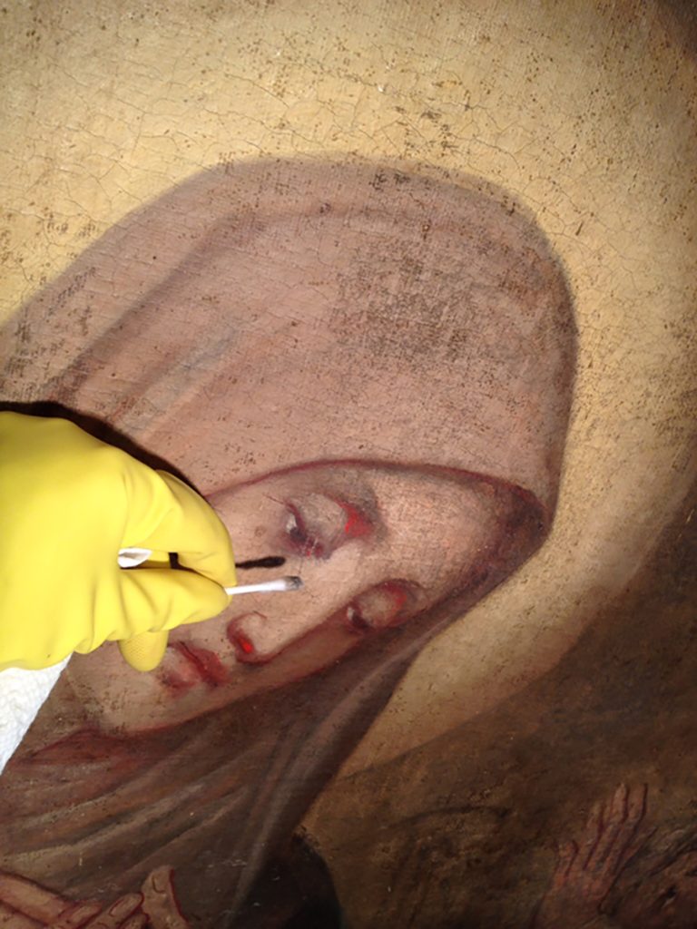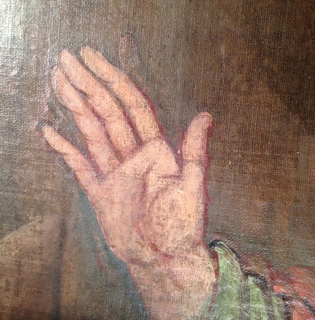 The thinning overpaint became “lean”, losing some of its oil as it aged. These changes created the illusion that a hand has more than five fingers. This is part of the painting’s history and, in this case, would not be “fixed” or painted over.