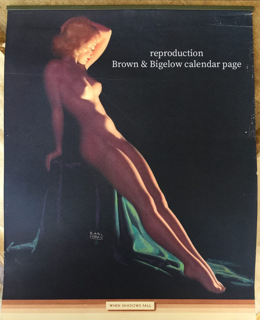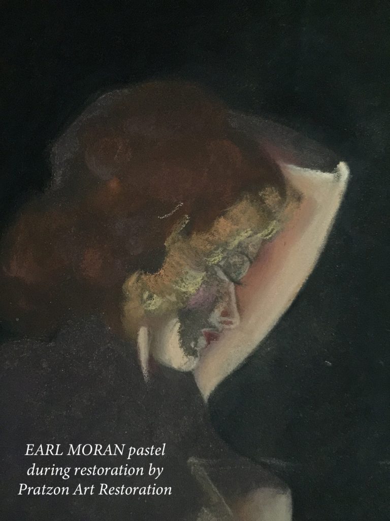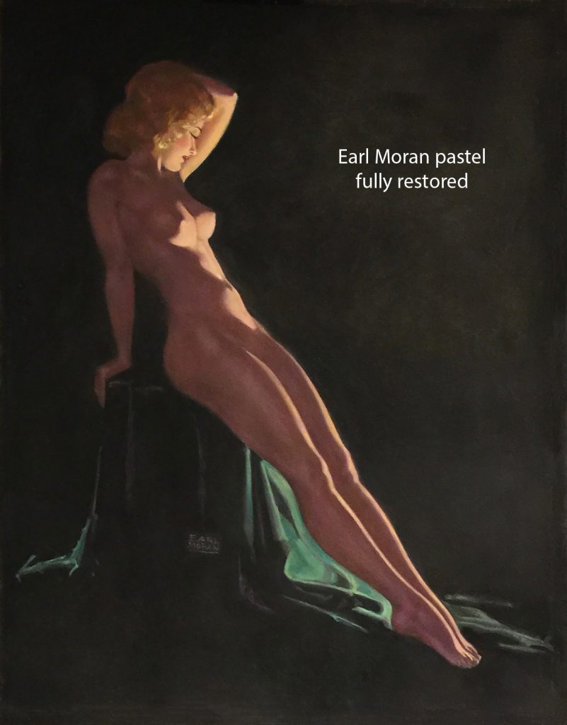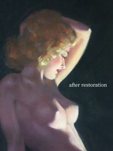 Decades ago, pastels were frequently categorized as paintings, but the powdery medium feels completely different from paint, and is far more susceptible to damage. Treating pastel on paper, board or canvas is a delicate challenge. When Pratzon Art Restoration received this Brown & Bigelow calendar illustration by pin-up artist Earl Moran (1893-1984), well known for discovering Marilyn Monroe when she was still Norma Jean Dougherty, the first step was to confirm that the calendar reproduction was available to use as reference. Without reference, restoration would be guesswork.